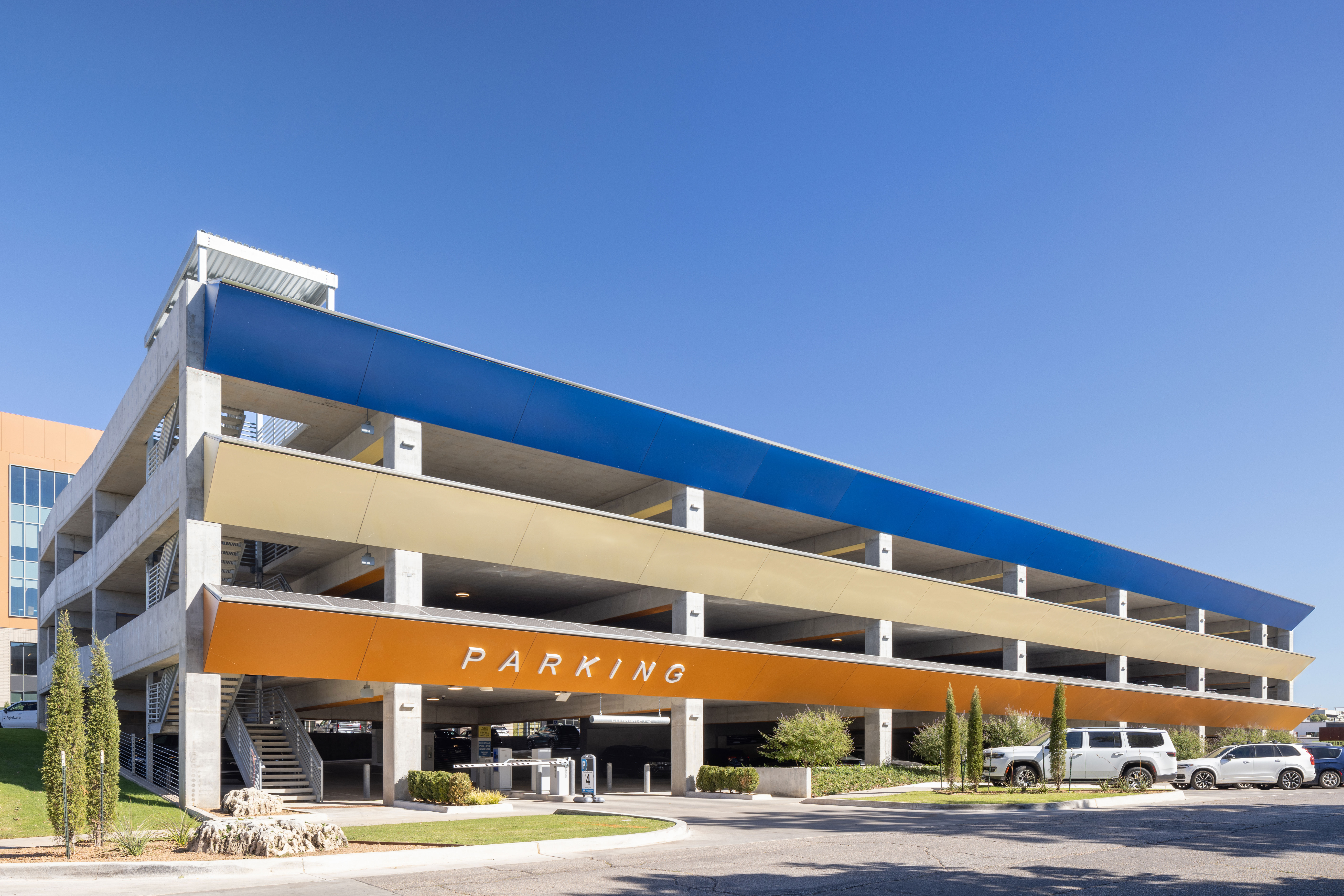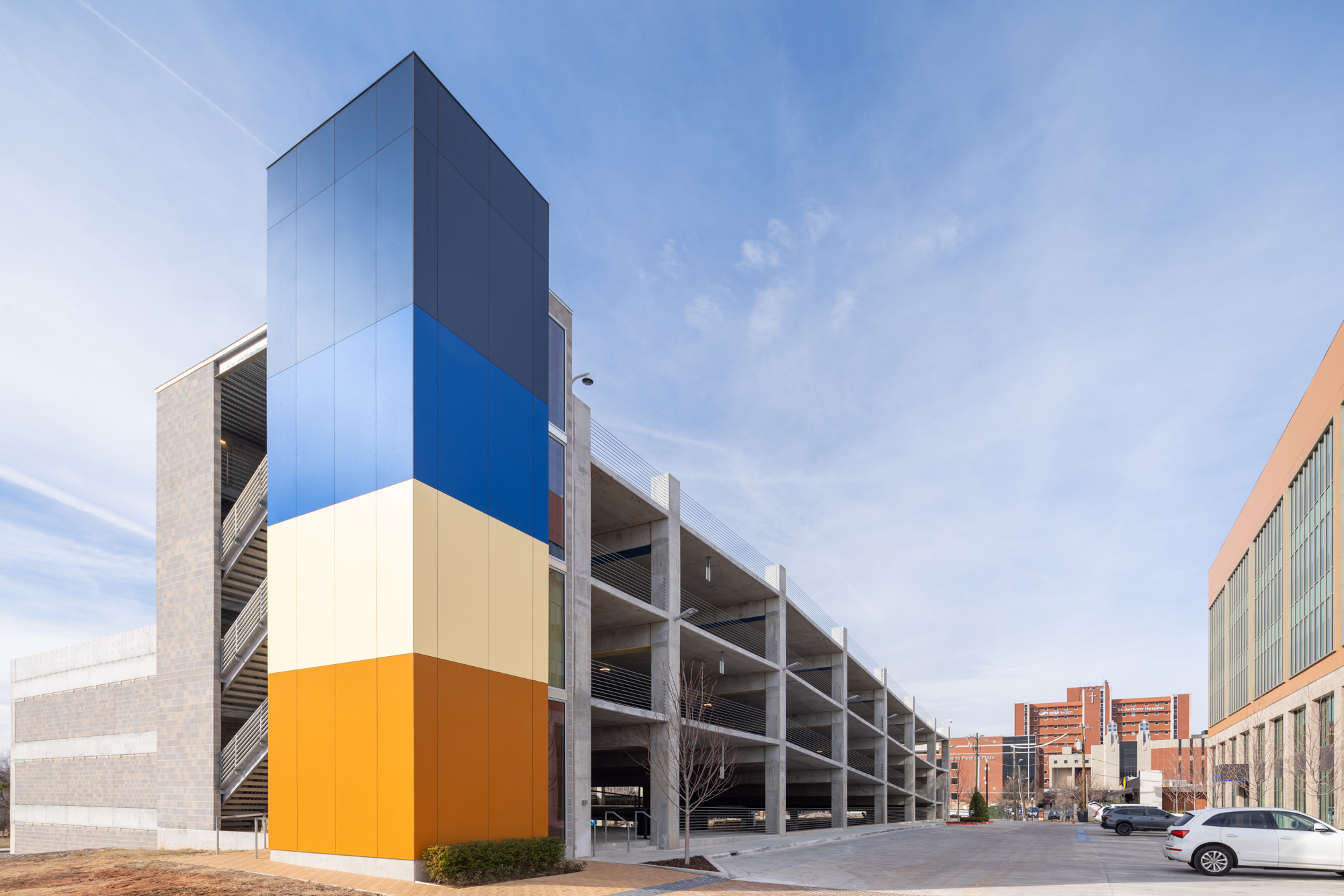 The 424 garage is a 4-level, 312-space public parking structure with solar arrays on the south street façade, providing power to the garage and adjacent office building. The Oklahoma sunset-hued bands of color are a subtle nod to the use of solar energy.